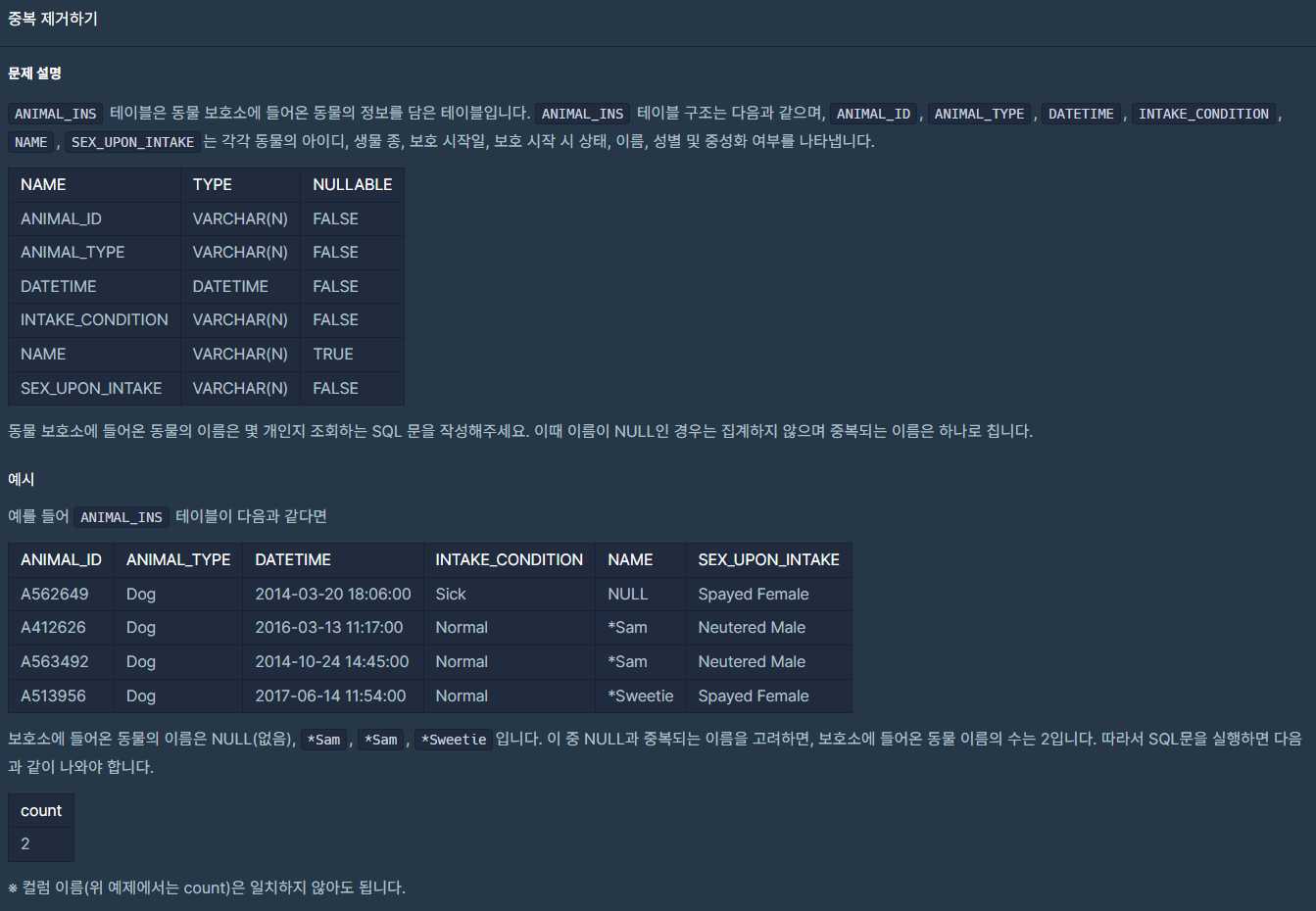 - DISTINCT를 사용하여 동물의 이름(NAME) 중복 제거
