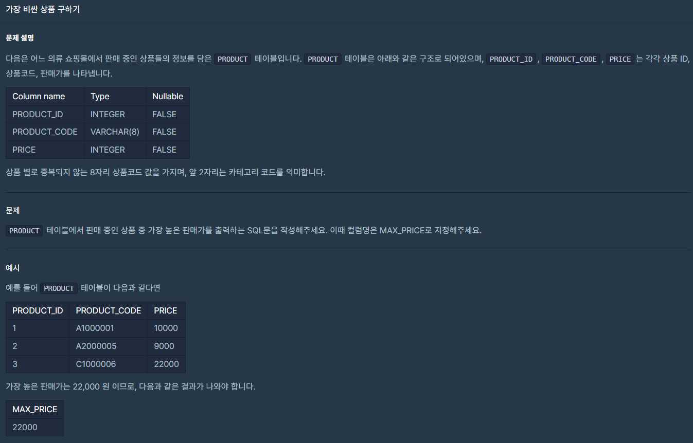 - MAX()를 이용하여 판매가(PRICE)의 최댓값 구하기