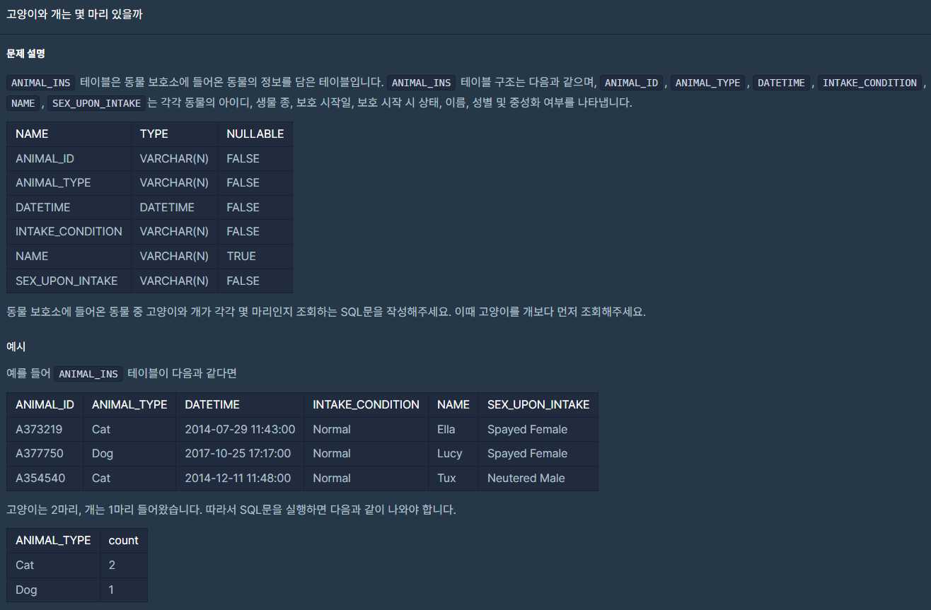 1. 동물 중 고양이와 개가 각각 몇 마리인지 조회