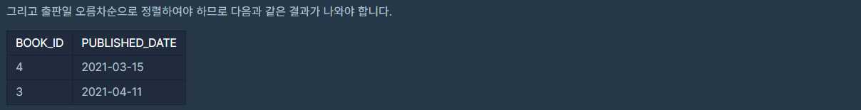 - DATE_FORMAT(PUBLISHED_DATE, ‘%Y-%m-%d’) : 출판일 (PUBLISHED_DATE) 년-월-일 으로 출력되도록